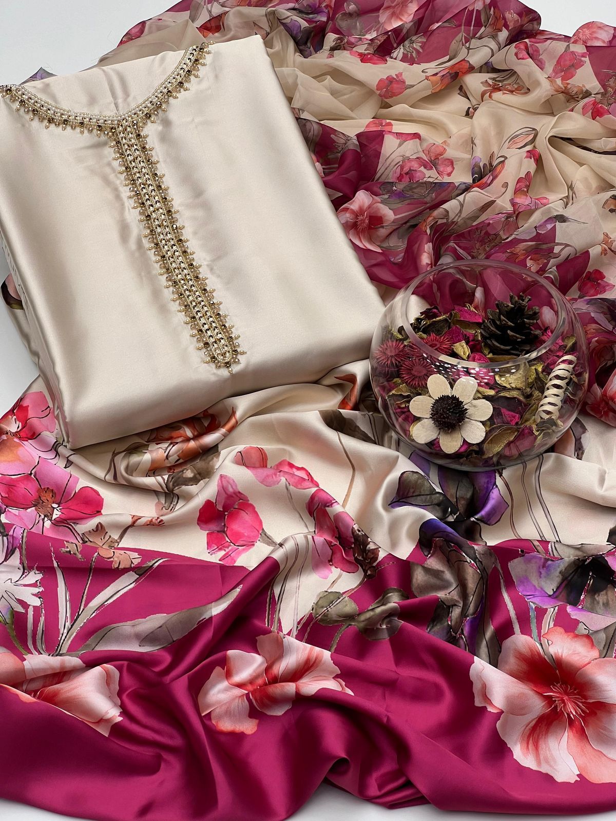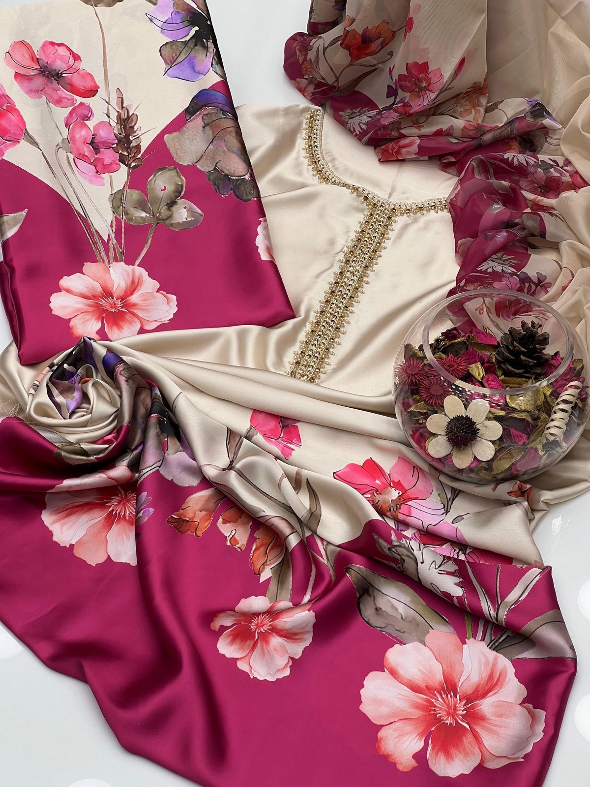 Shamoze Silk Fancy Neck Work & Digital Print Shirt With Digital Print Shamoze Silk Trouser Along With Silk Digital Print Dupatta 3Pcs Dress π.