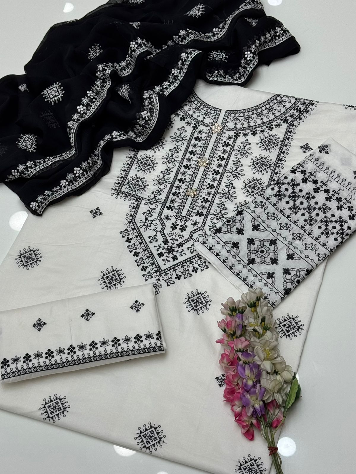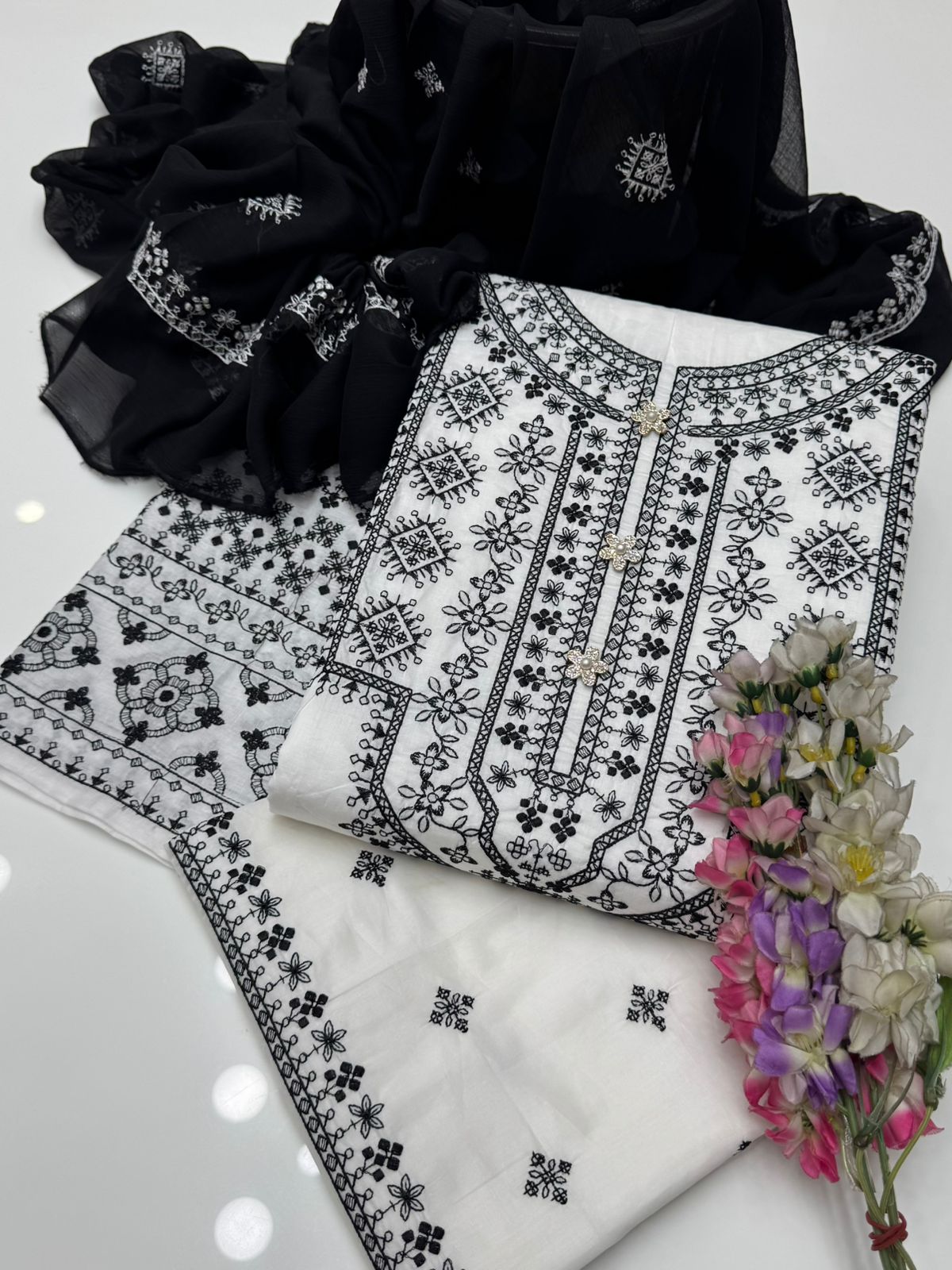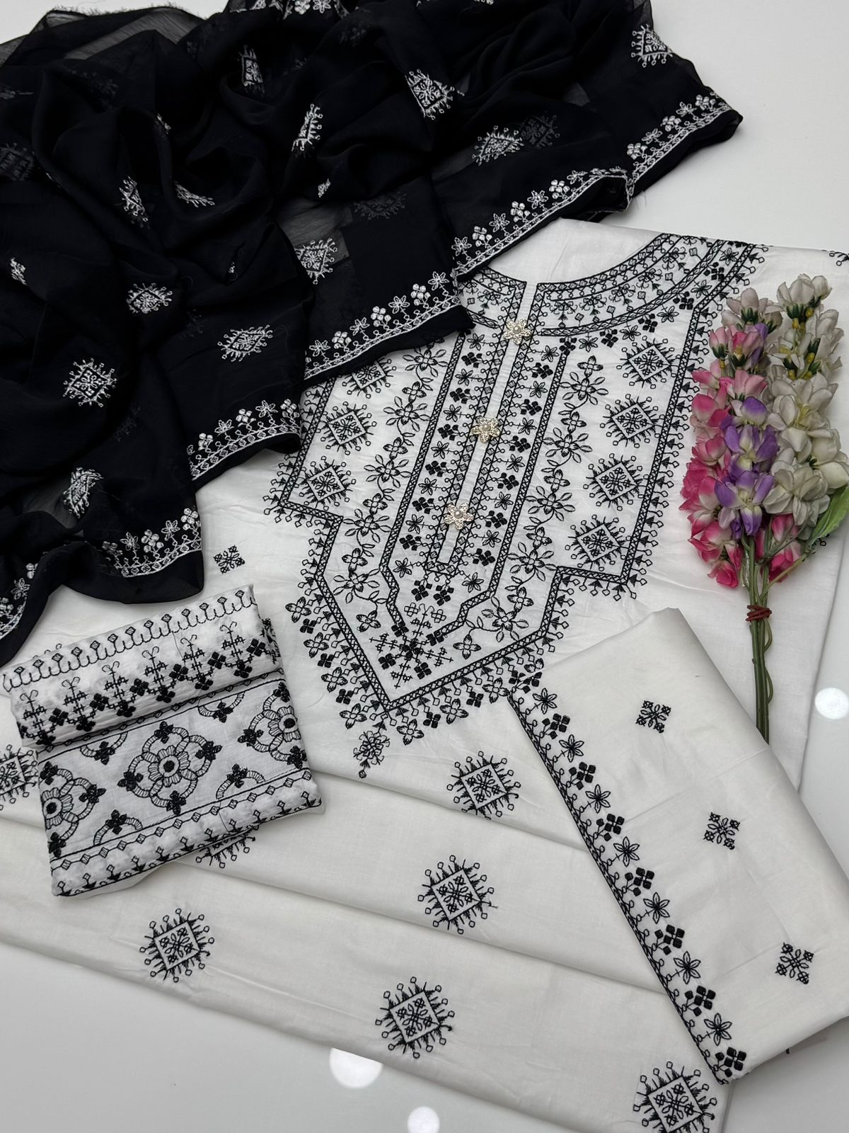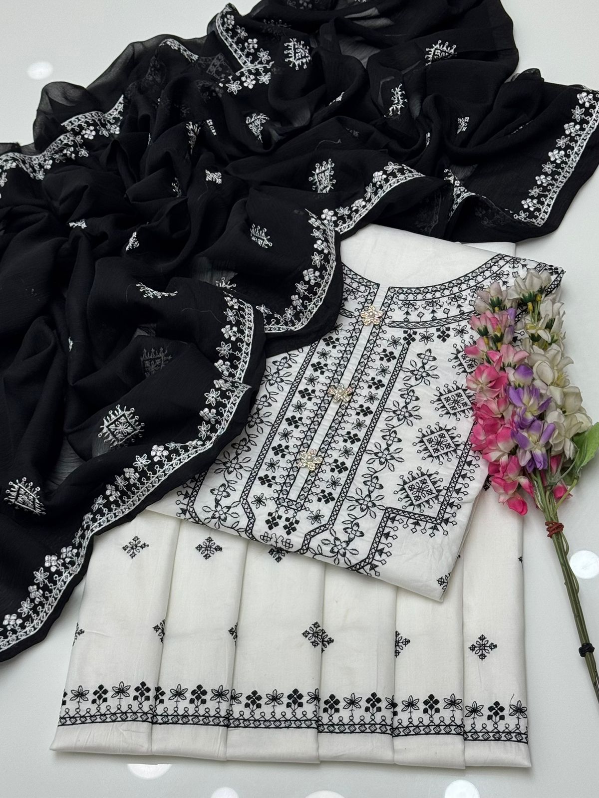 Beautiful Handmade Style Embroidered 🧵Galla & Sleeves Pure Lawn Shirt & Trouser Along With Chiffion Embroidered Duppata 3 Pc Dress 👗